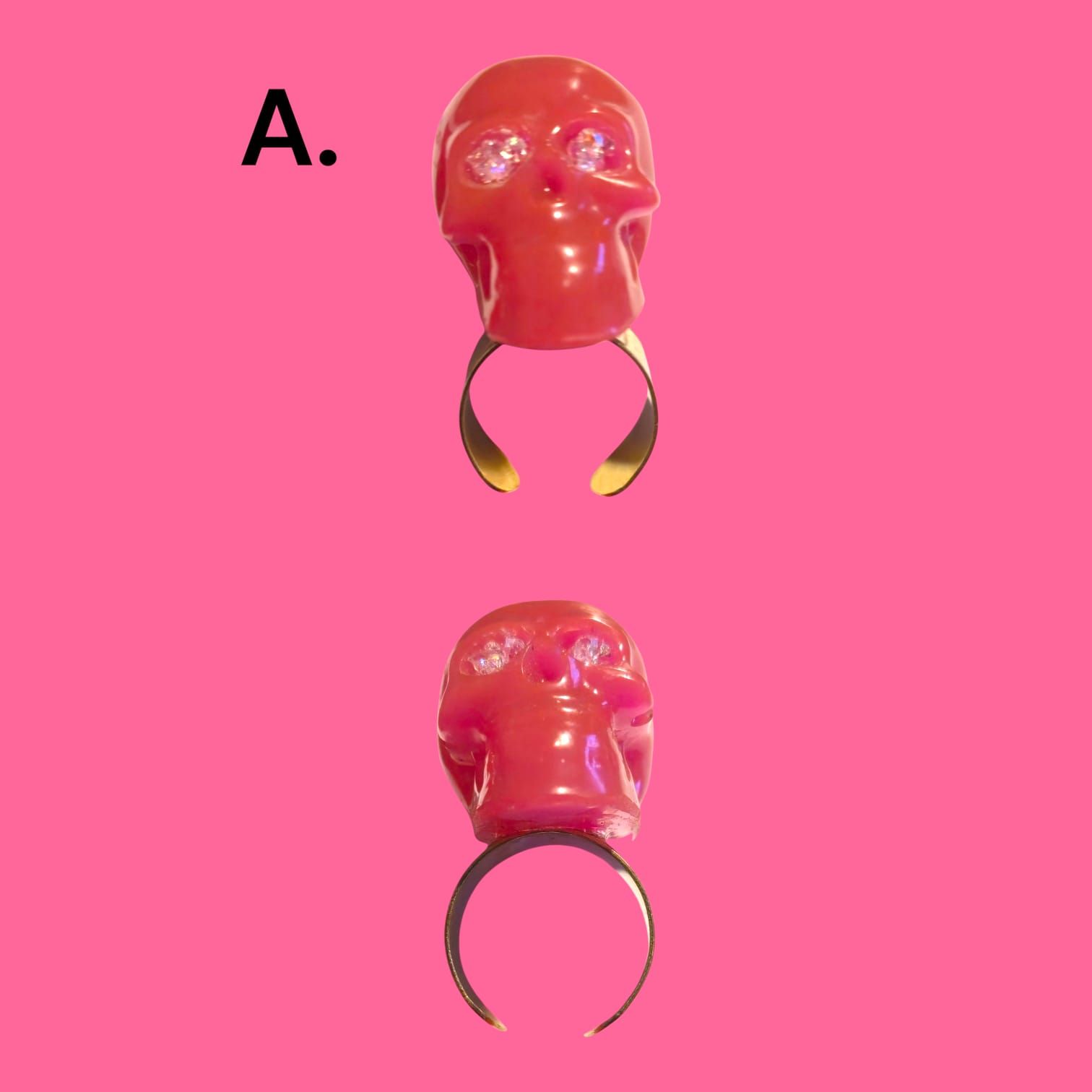 F. Anillo ajustable color bronce con calavera color frambuesa y ojos de brillo blanco.