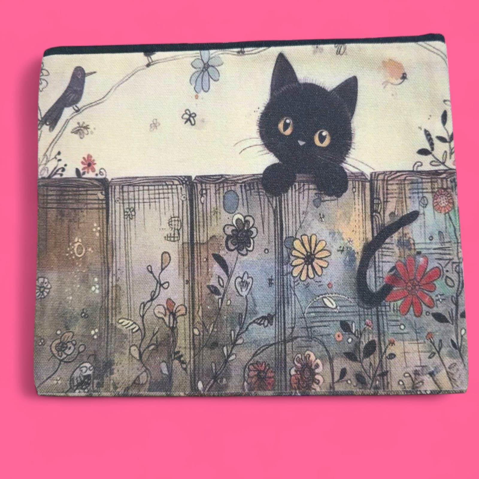 Estuche de gato negro sobre un cerco con pajaros y flores