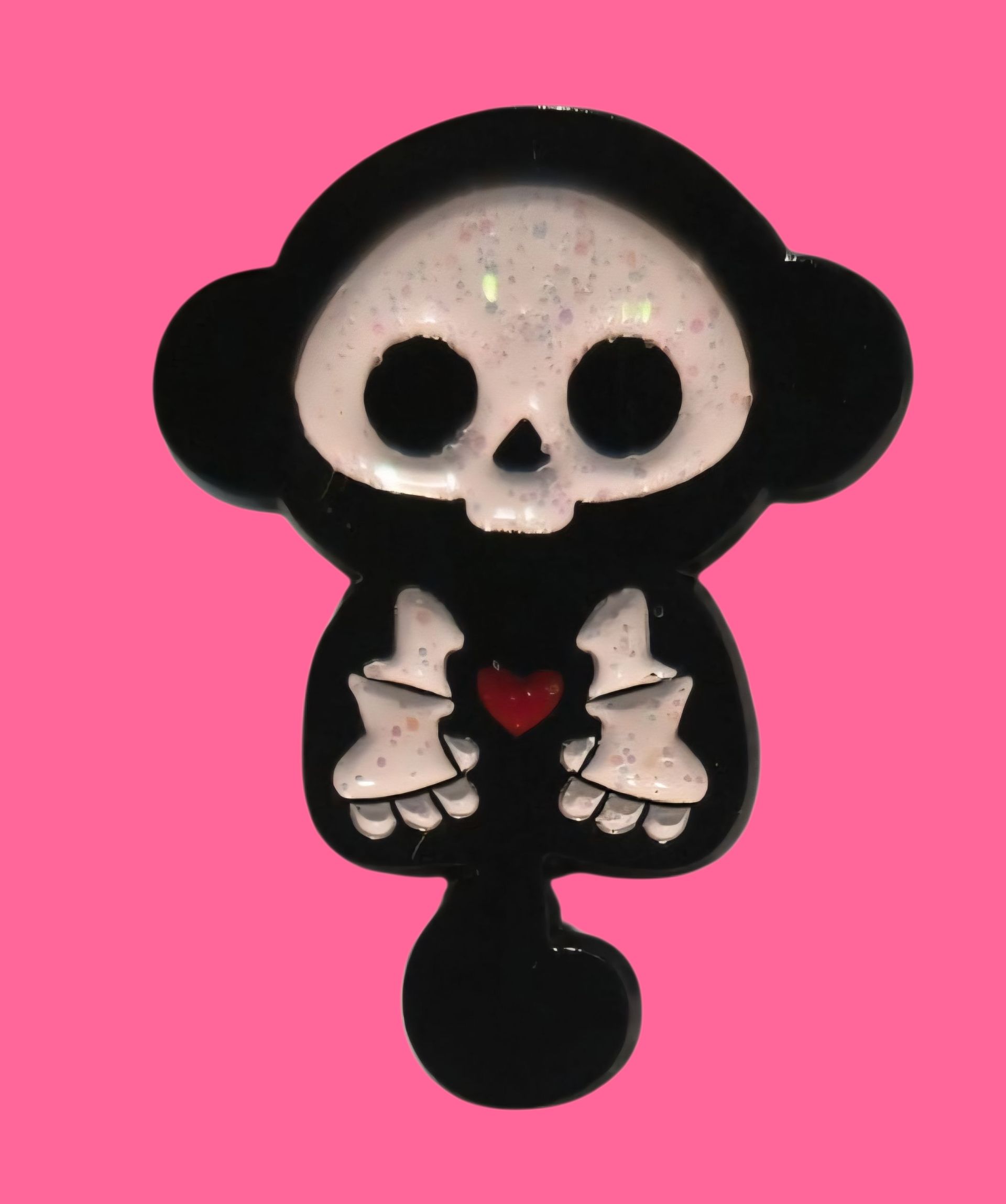 Pin metálico de un esqueleto de mono blanco con fondo negro y un corazón rojo en el pecho.