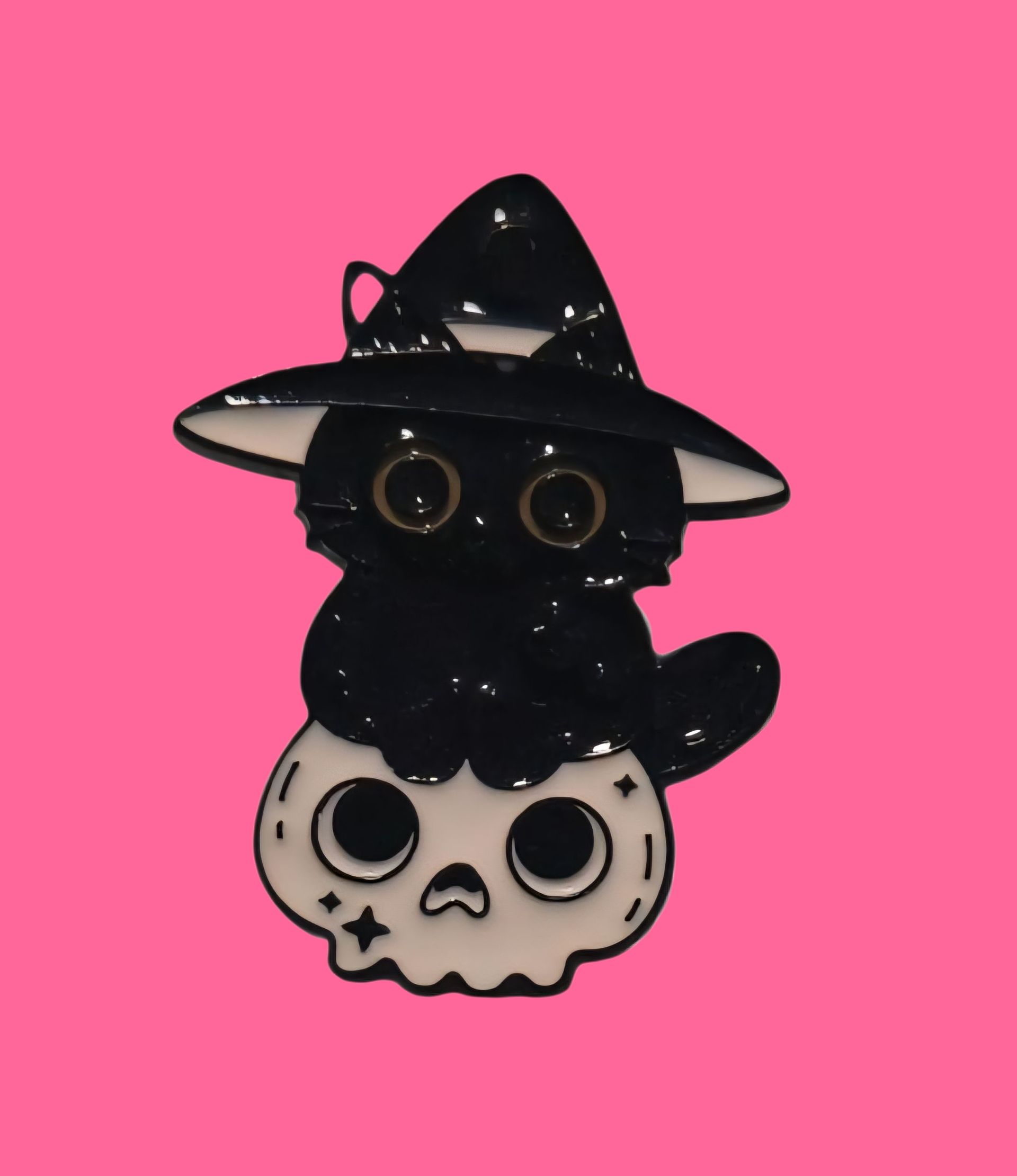 Pin metálico de un gato negro con sombrero de bruja sentado sobre un cráneo humano de color blanquecino.
