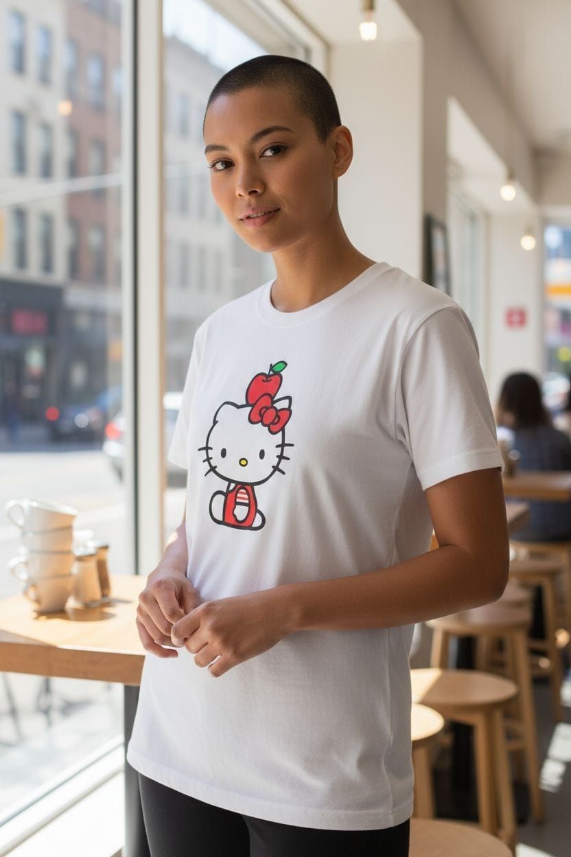 Polera blanca de algodón, escotada y manga corta. Estampado frontal de Kitty con manzana sobre la cabeza como Guillermo Tell.