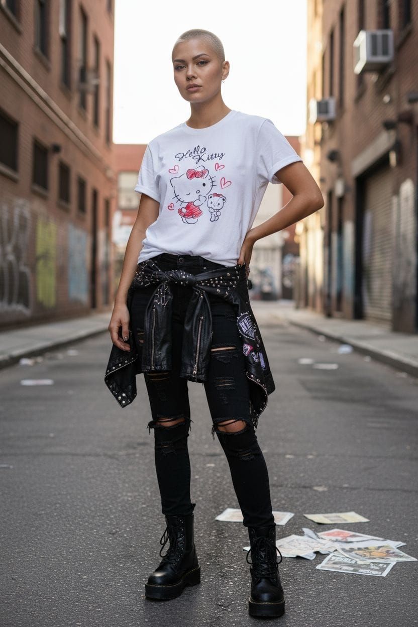 Polera blanca de Kitty junto a un osito de peluche