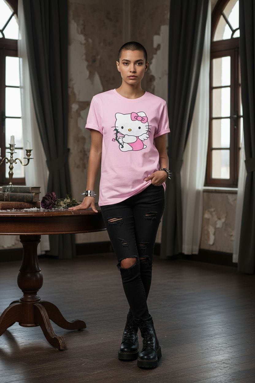 Polera rosada de algodón, cuello redondo y manga corta. Estampado delantero de Kitty como cupido con un arco y una flecha.