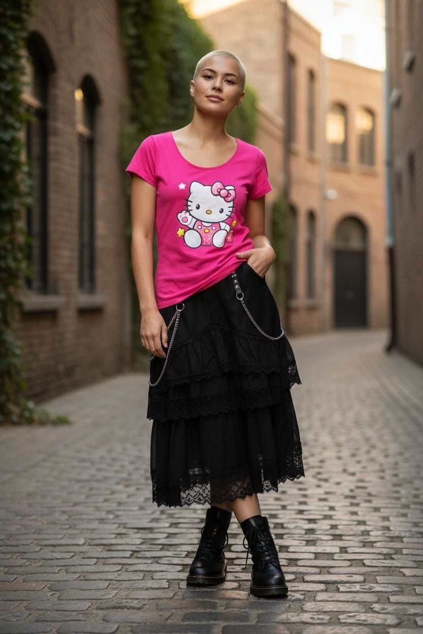 Polera fucsia de algodón, escotada y manga corta. Estampado delantero de Kitty saludando junto a estrellas.