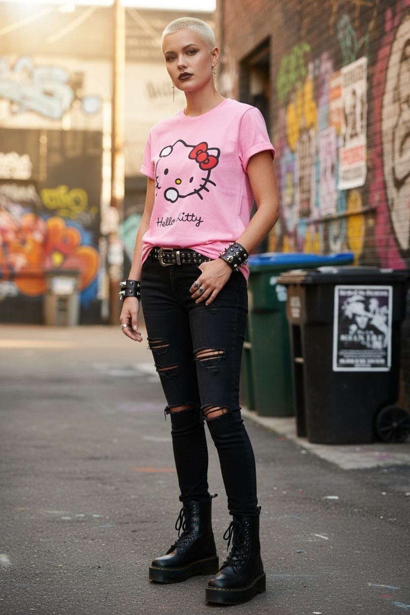 Polera rosada de algodón, cuello redondo y manga corta. Estampado delantero con cara de Kitty que parece asomarse. Talla M: Ancho de 43 cm y Alto de 62 cm.